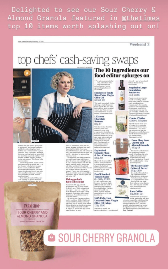 We were delighted to see our Sour Cherry & Almond Granola featured in The Times Weekend (21st February 2026)— a wonderful recognition for one of our most popular artisan blends.